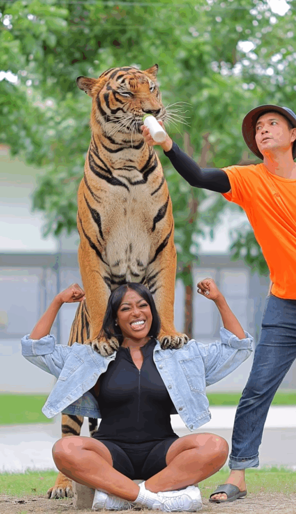 When Nigerian actress Ms DSF posted her tiger photo shoot from Thailand, the internet ignited. Fifteen million people watched as she posed with an adult tiger, its paws draped over her shoulders while two handlers distracted it with a bottle of milk. The video, filmed at Tiger World in Nakhon Pathom, became an instant hit — an image of confidence, faith, and fearlessness. But what looked like courage was captivity polished for the camera.